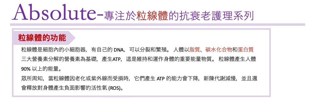 Absolute 研發出有效的原創複合成分能 『修復』及『激活』皮膚粒線體功能