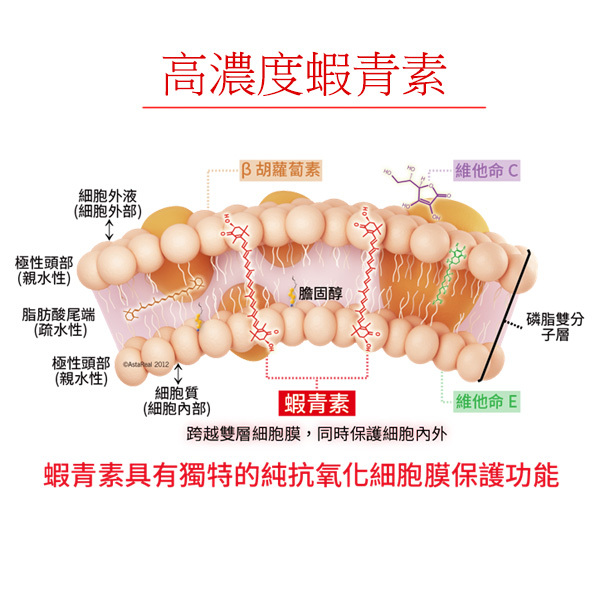 此外,蝦青素的分子結構讓它能夠穿過細胞膜,提供深層細胞保護,保護細胞核基因和細胞內物質免受損害。最重要的是,蝦青素是純粹的抗氧化物質,永遠不會轉變成促氧化物,這意味著它能夠持續提供保護,而不會引發反效果。